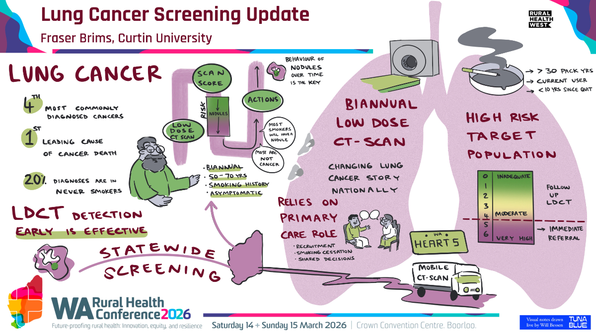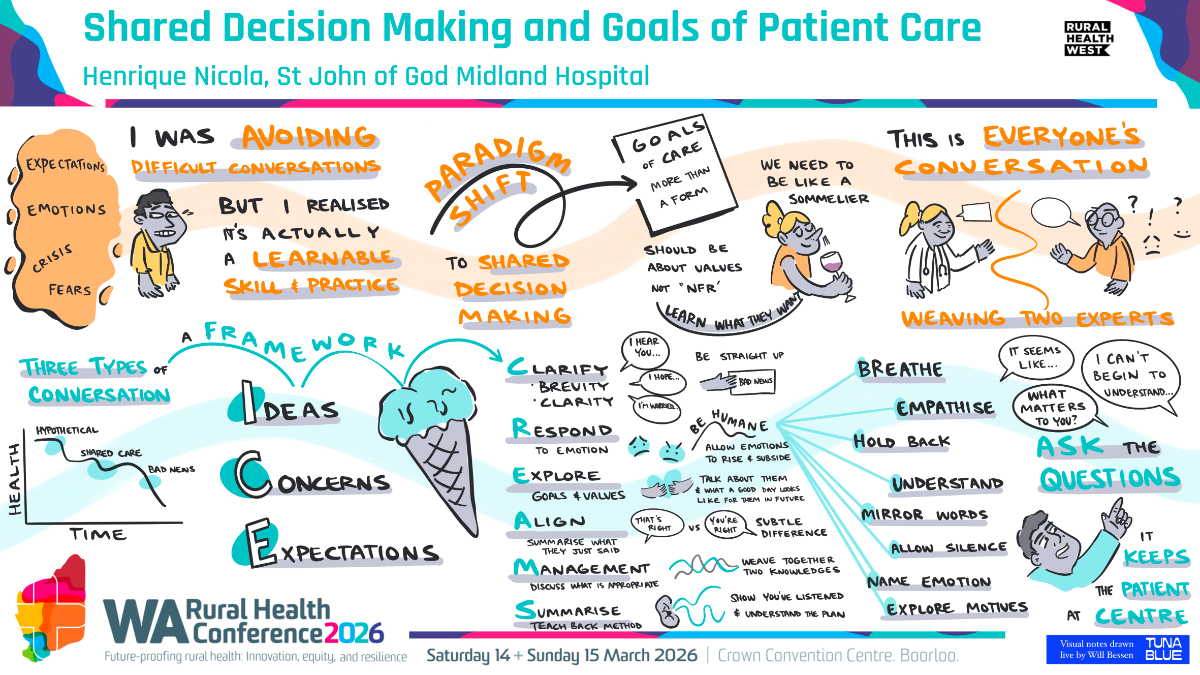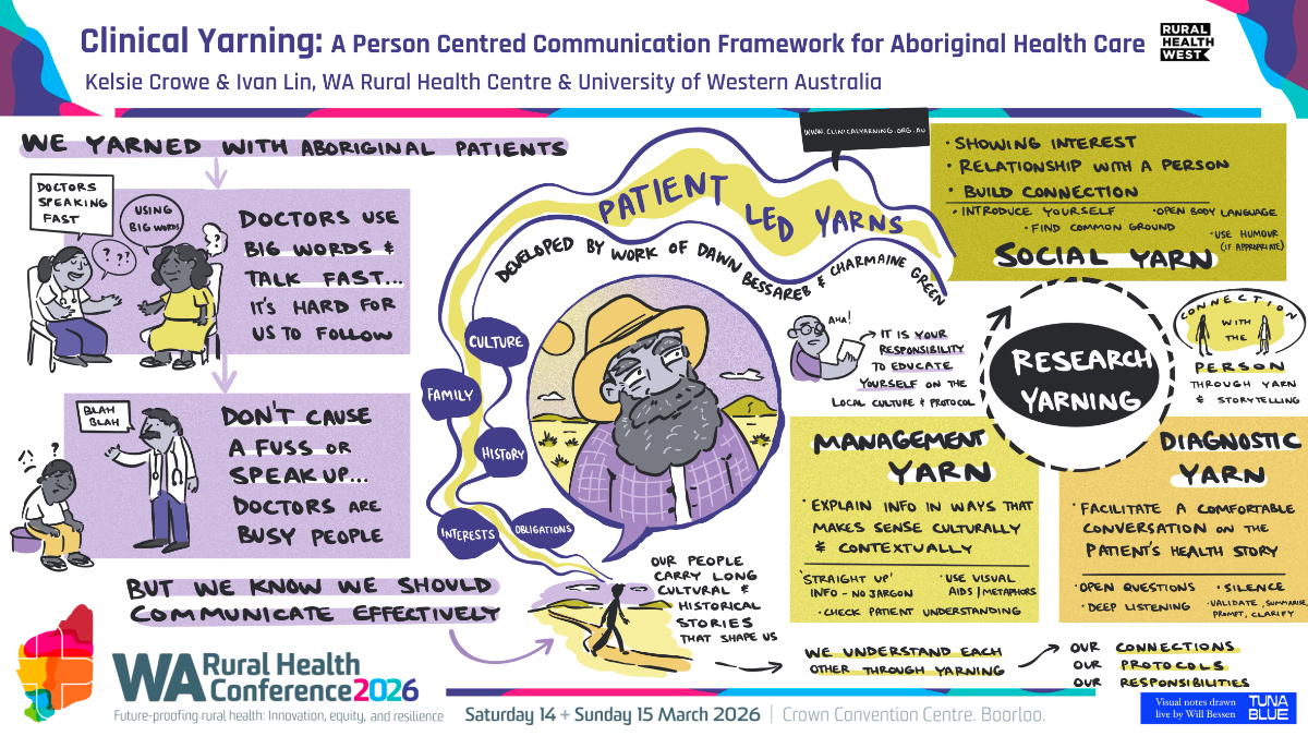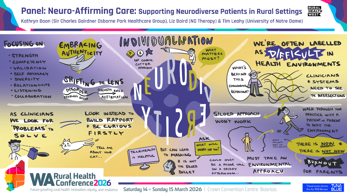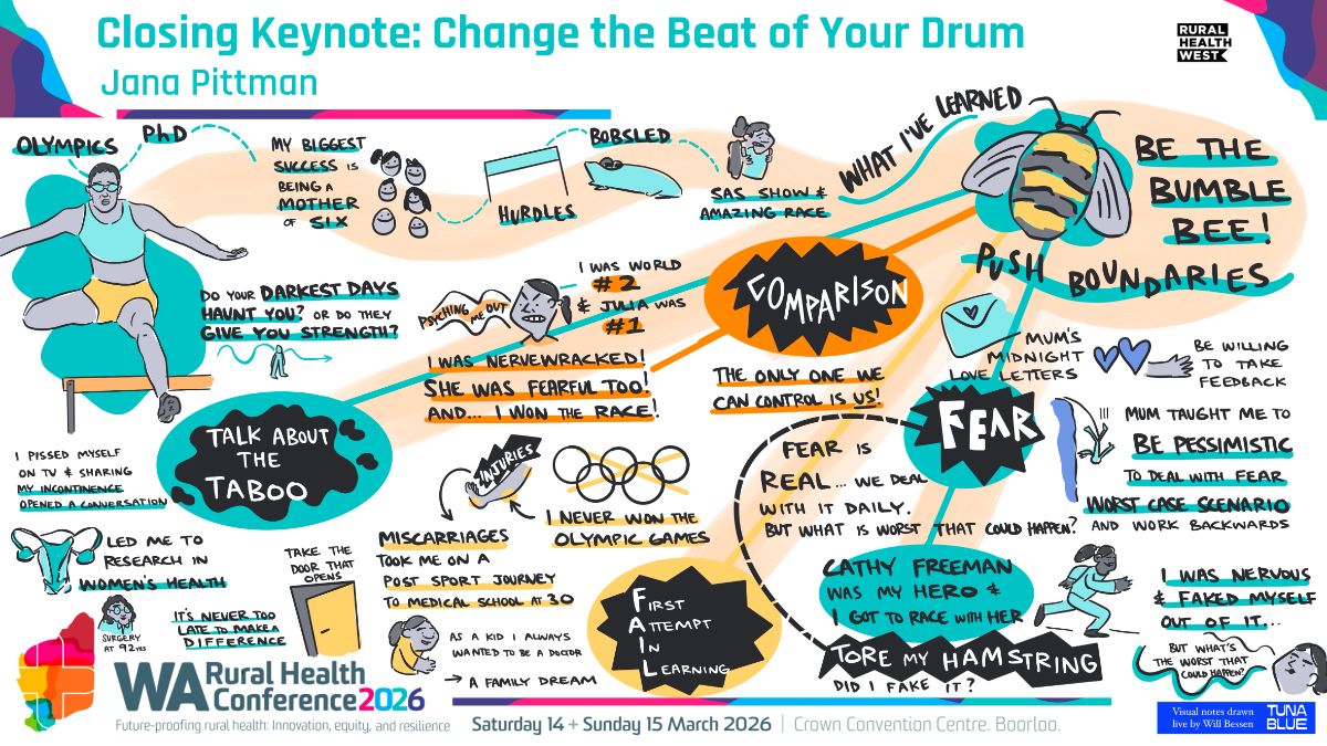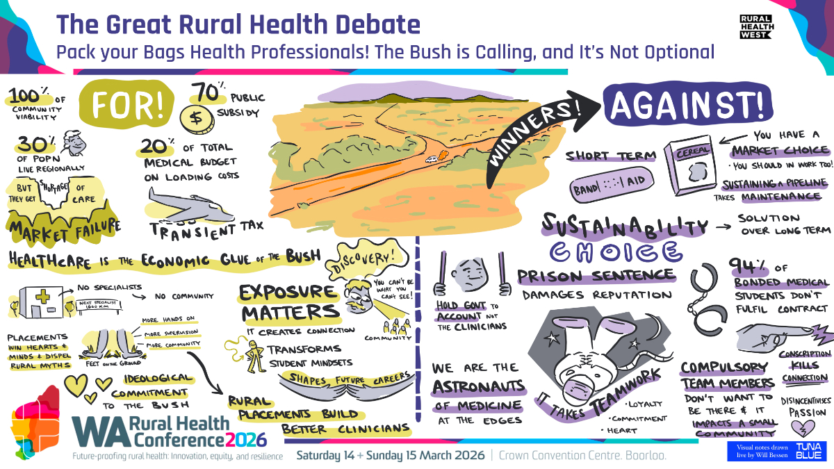 Explore our gallery of graphic recordings, created by Tuna Blue, from previous WA Rural Health Conferences. These visually engaging summaries capture key insights, ideas, and discussions from our events, bringing them to life in a creative and memorable way.